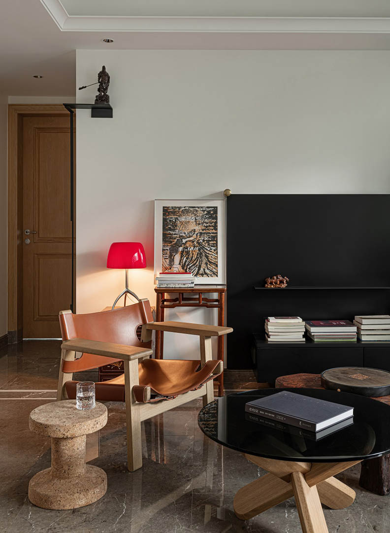 客廳里一對黃花梨的圈椅,配有19世紀法國壁爐,并與中國傳統香爐做一個對話。 墻面山水畫是著名畫家童老師的作品,畫中內容為西湖景色,與男主人從小出生在杭州有了聯系。客廳里的中國傳統擺件,都是主人收藏,茶幾是一塊老樹瘤茶臺改裝而用,沙發選用意大利FLEXFORM的牛皮質感,很好平衡了空間傳統中式屬性過多后帶來嚴肅感。搭配沙發的主人椅為西班牙人椅,由BORGE MOGENSEN所創作,靈感來源于中世紀西班牙座椅結構,寬大的扶手又可追溯到古伊斯蘭文化。