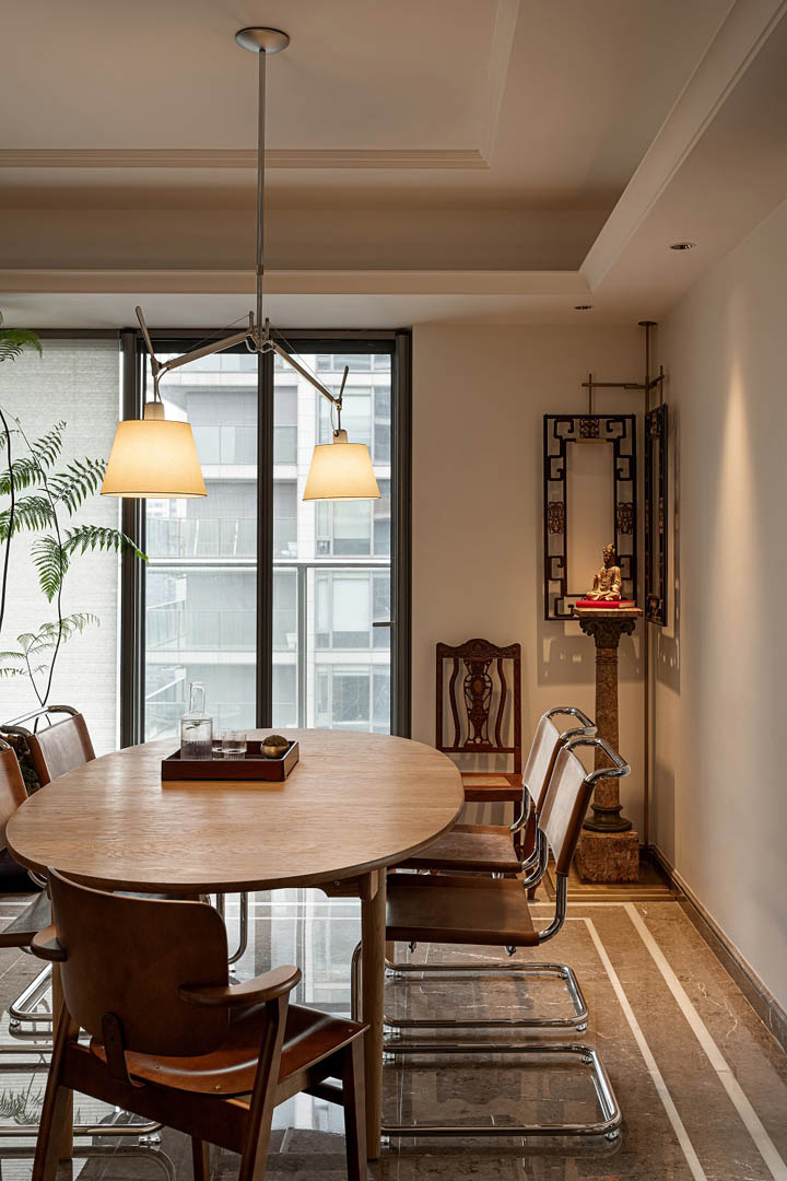 餐廳角落里,一對傳統清中式屏風,搭配定制的掛架,配有山西的木胎佛像,底座為歐洲石制柱頭, 在地理版圖上東西長廊,時空上18~19世紀來了一次有趣的重逢。餐廳配置了德國THONET椅子和丹麥CARIHANSEN&SON。主人收藏的一張民國餐椅,安置在不起眼的角落,造型的豐滿,它又不限于此,躍躍欲試。