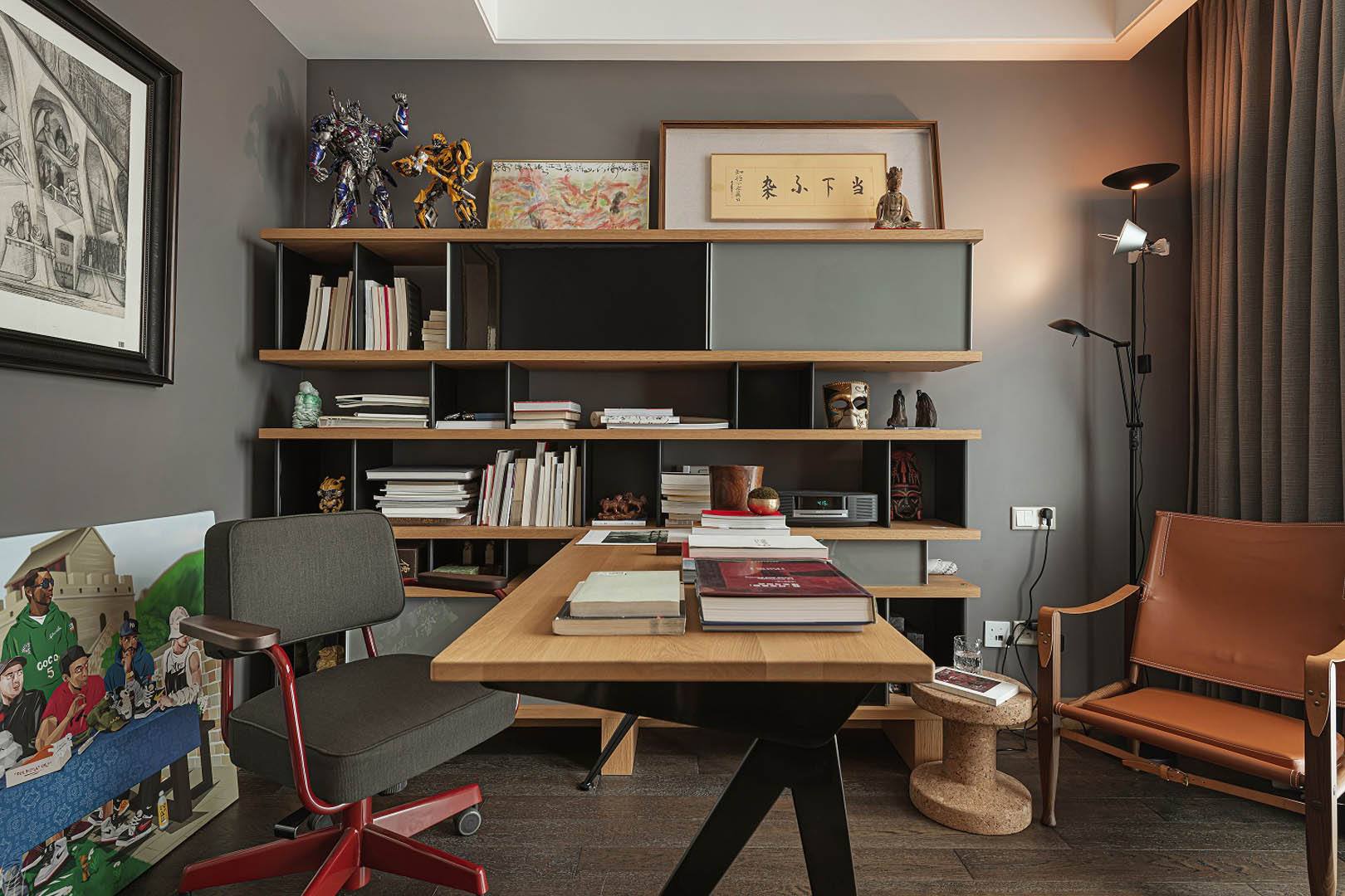 書房打造的初意,就是成年人愛好空間,CASSINA的書柜,簡約的氣質要承載更多的收藏和存放的功能,傳統雕件相配其中,馮峰老師的魚群畫作也游戲之間。Vitra的書桌椅,背后是當代藝術家DIGIWAY的最后晚餐。