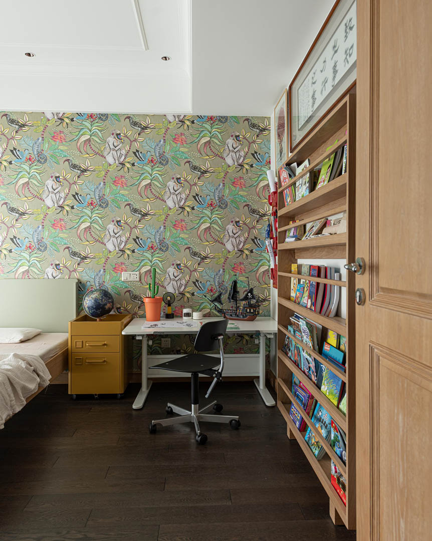 男孩房間,選用COLE&SON老牌壁紙專家的鮮花植物圖案,空間上盡可能擴大孩子的玩樂地盤,書柜,玩具柜都做了垂直化處理,在書架上方,還有馮峰老師的奇思妙想的小狗。